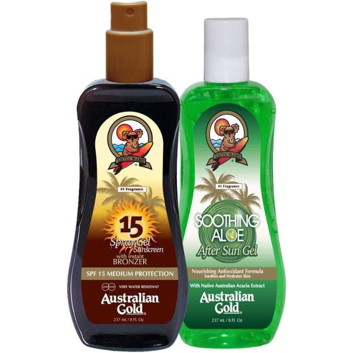 Australian Gold ‘SPF 15 Spray Gel met bronzer’ zonnebrandspray beschermt perfect tegen UVA en UVB. Door de natuurlijke karamel bronzers wordt je ook sneller en dieper bruin. Australian Gold “Soothing Aloe After Sun Gel” is een olievrije gel die je huid verkoelt, verfrist en verzacht.
